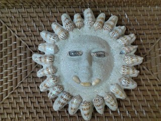 This beautiful sun was created with Seashells, Sea Glass, and lots of sand. a great addition inside or outside your home.