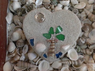 This small beautiful piece of art is made with sand, seashells and gems. It is about eight inches in height and five inches in width. Perfect token for a beach wedding your initials can also be incorporated for a very personalized special momento to remember your special day.
