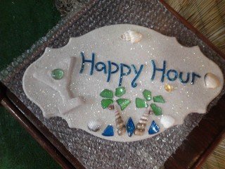 This piece is perfect for your tiki bar,of course it can be personalized with your family or business name. Notice the 3D cocktail glass and the palm trees made with Exotic Seashells and SeaGlass.