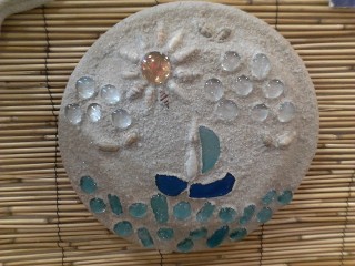 Round Mold with a beautiful Semi abstract depiction of a small sail boat at sea on a sunny day. The details on this Item are made with Sea glass, Seashells, gems and lots of care.